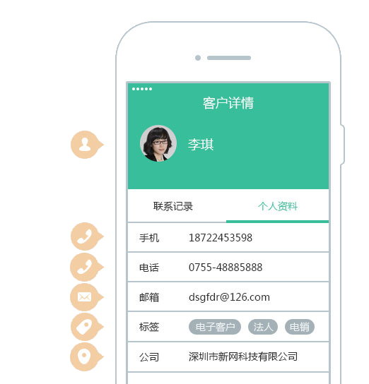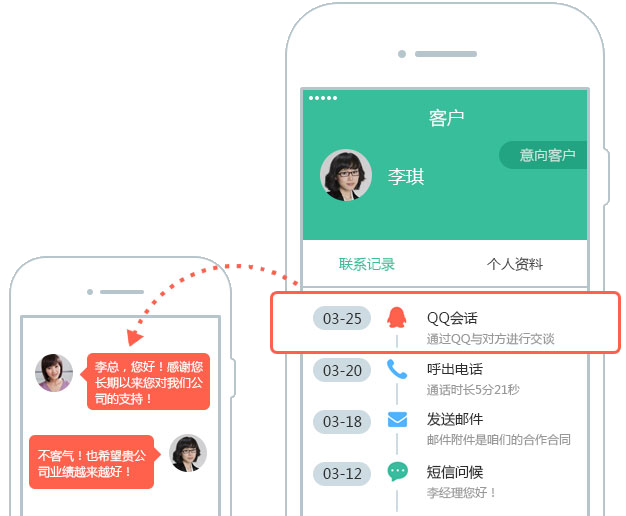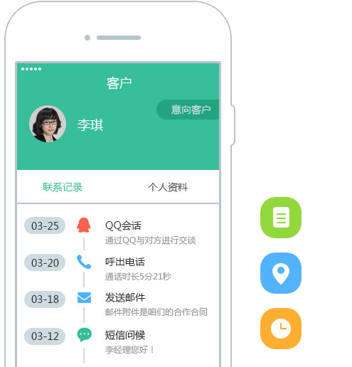 客戶(hù)資料一鍵導(dǎo)入,與客戶(hù)的QQ、手機(jī)、郵件、電話、網(wǎng)頁(yè)等無(wú)縫連接,響應(yīng)客戶(hù)需求,銷(xiāo)售快人一步